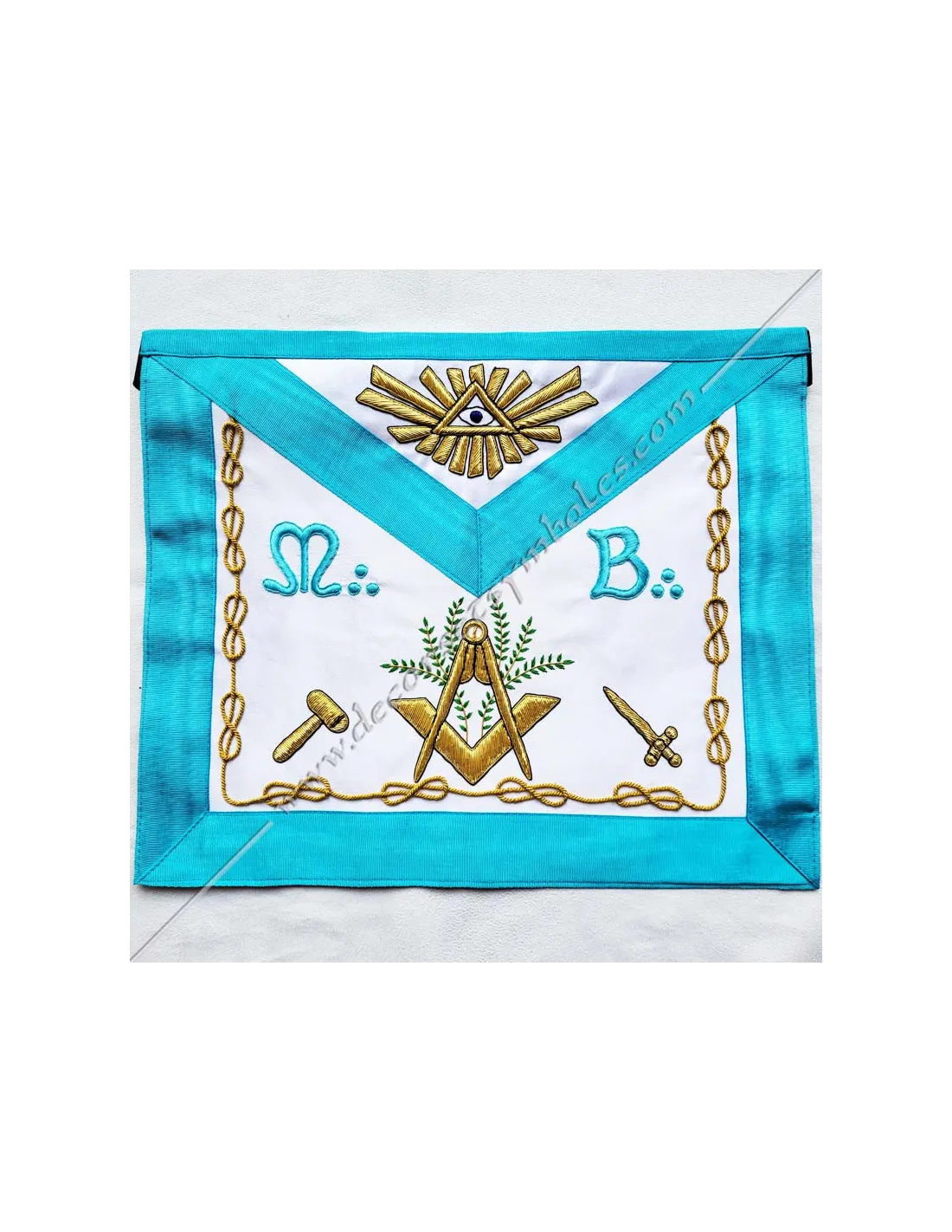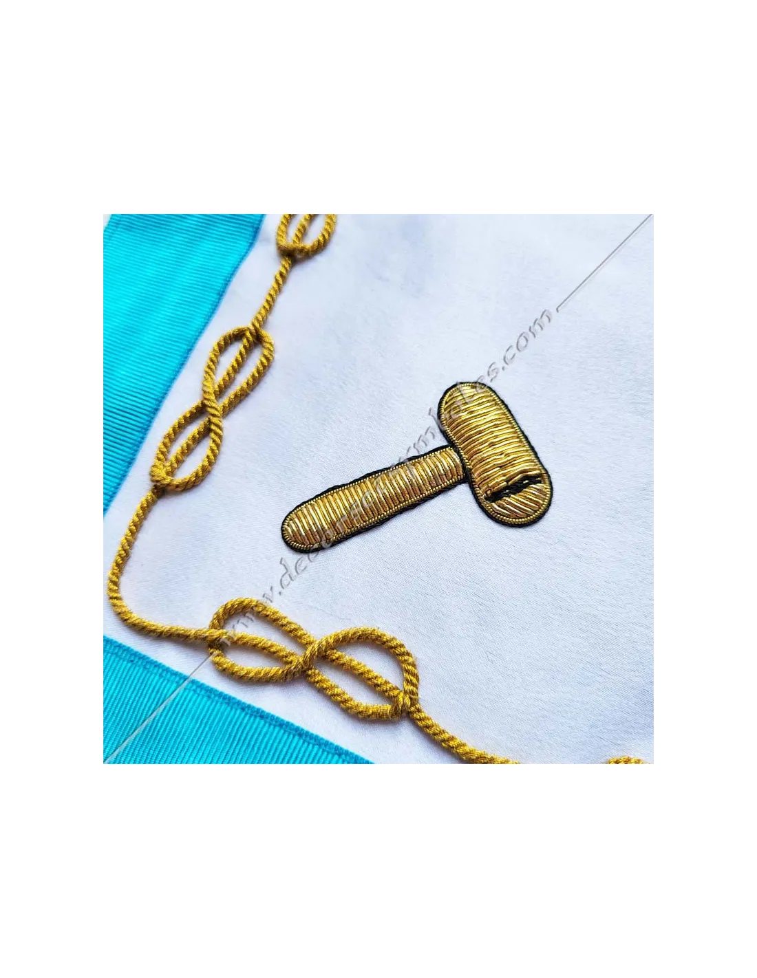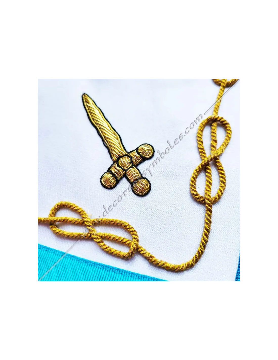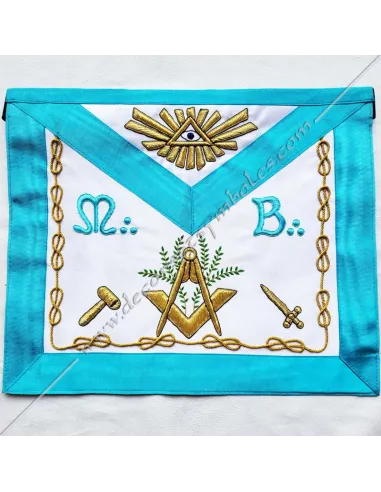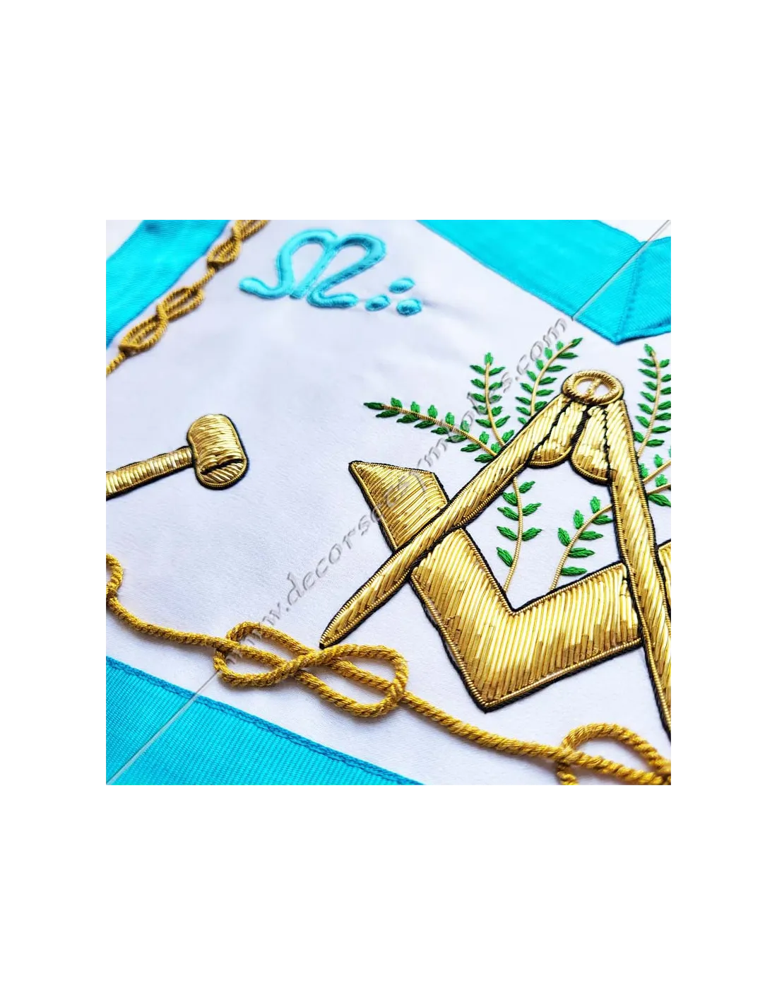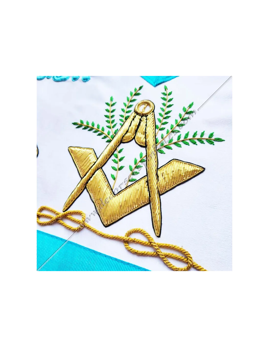 Embroidery of mallet and sword, set square and compasses, acacia branches, glory with eye