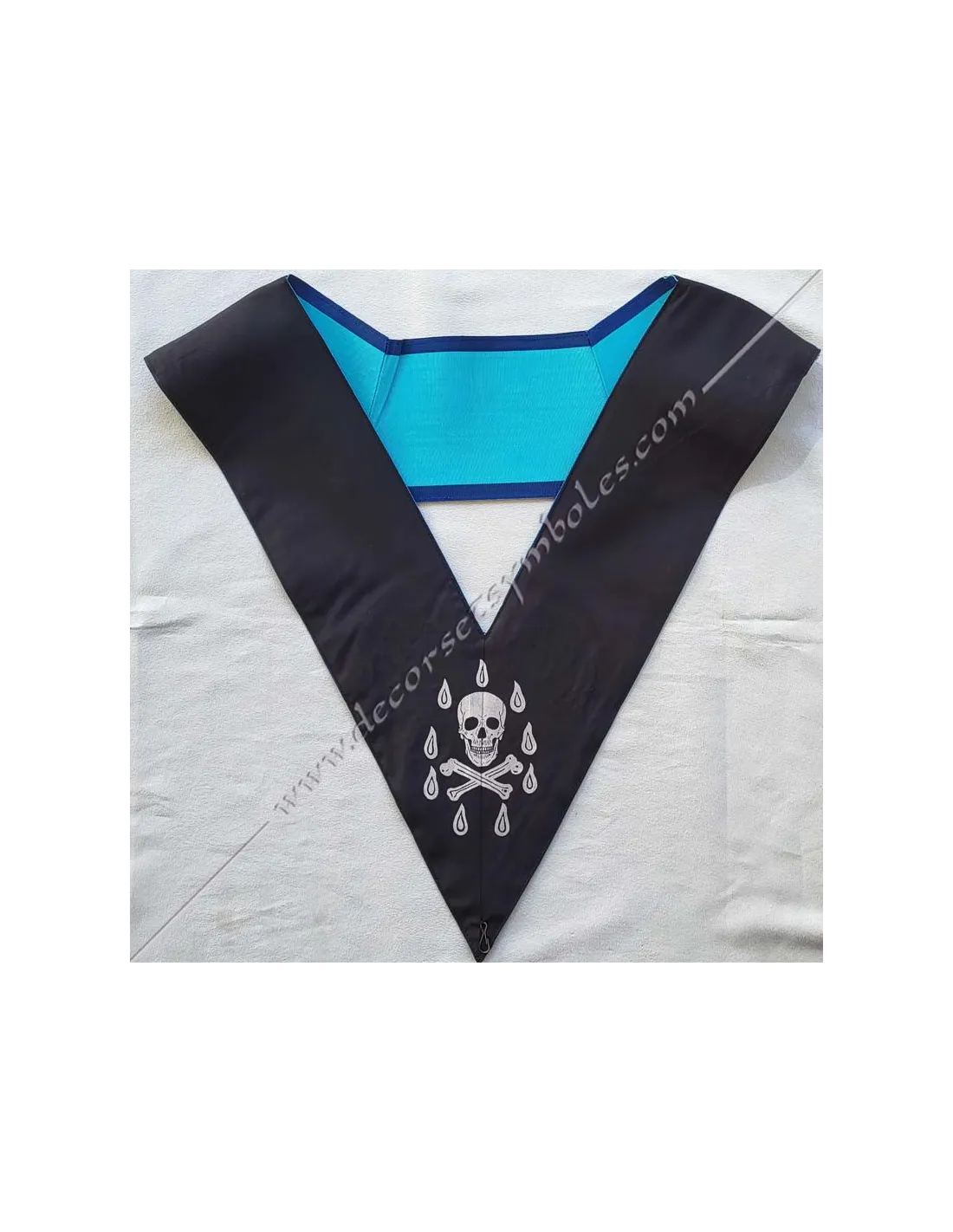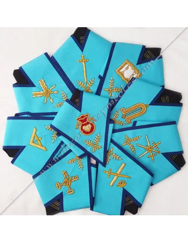 Set of 10 Misraim officer's masonic collars or sashes in turquoise blue moiré ribbon edged in blue