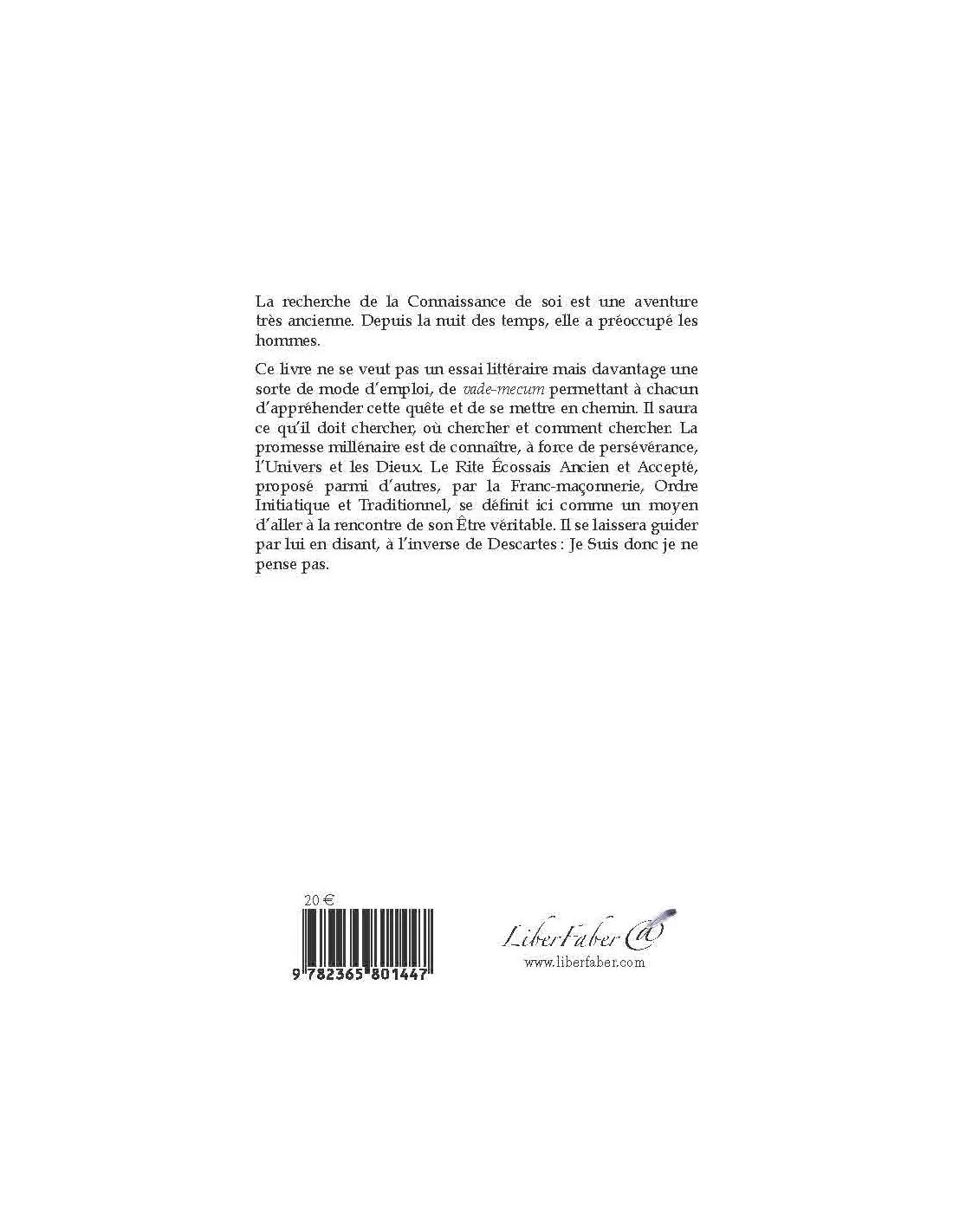 Ce livre ne se veut pas un essai littéraire mais davantage une sorte de mode d’emploi, de vade-mecum permettant à chacun d’appréhender cette quête et de se mettre en chemin. Il saura ce qu’il doit chercher, où chercher et comment chercher. La promesse millénaire est de connaître, à force de persévérance, l’Univers et les Dieux. Le Rite Écossais Ancien et Accepté, proposé parmi d’autres, par la Franc-maçonnerie, Ordre Initiatique et Traditionnel, se définit ici comme un moyen d’aller à la rencontre de son Être véritable. Il se laissera guider par lui en disant, à l’inverse de Descartes : Je Suis donc je ne pense pas.