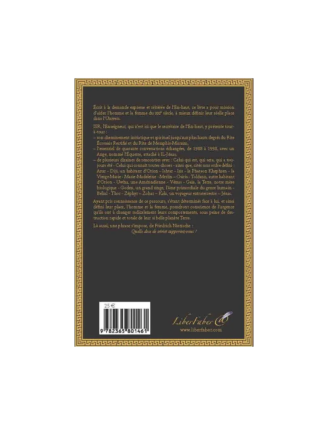ISR, l’Enseigneur, qui n’est ici que le secrétaire de l’En-haut, y présente tour-à-tour : - son cheminement initiatique et spirituel jusqu’aux plus hauts degrés du Rite Écossais Rectifié et du Rite de Memphis-Misraïm, l’essentiel de quarante conversations échangées, de 1988 à 1998, avec un Ange, nommé l’Équerre, attaché à IL-Jésus,