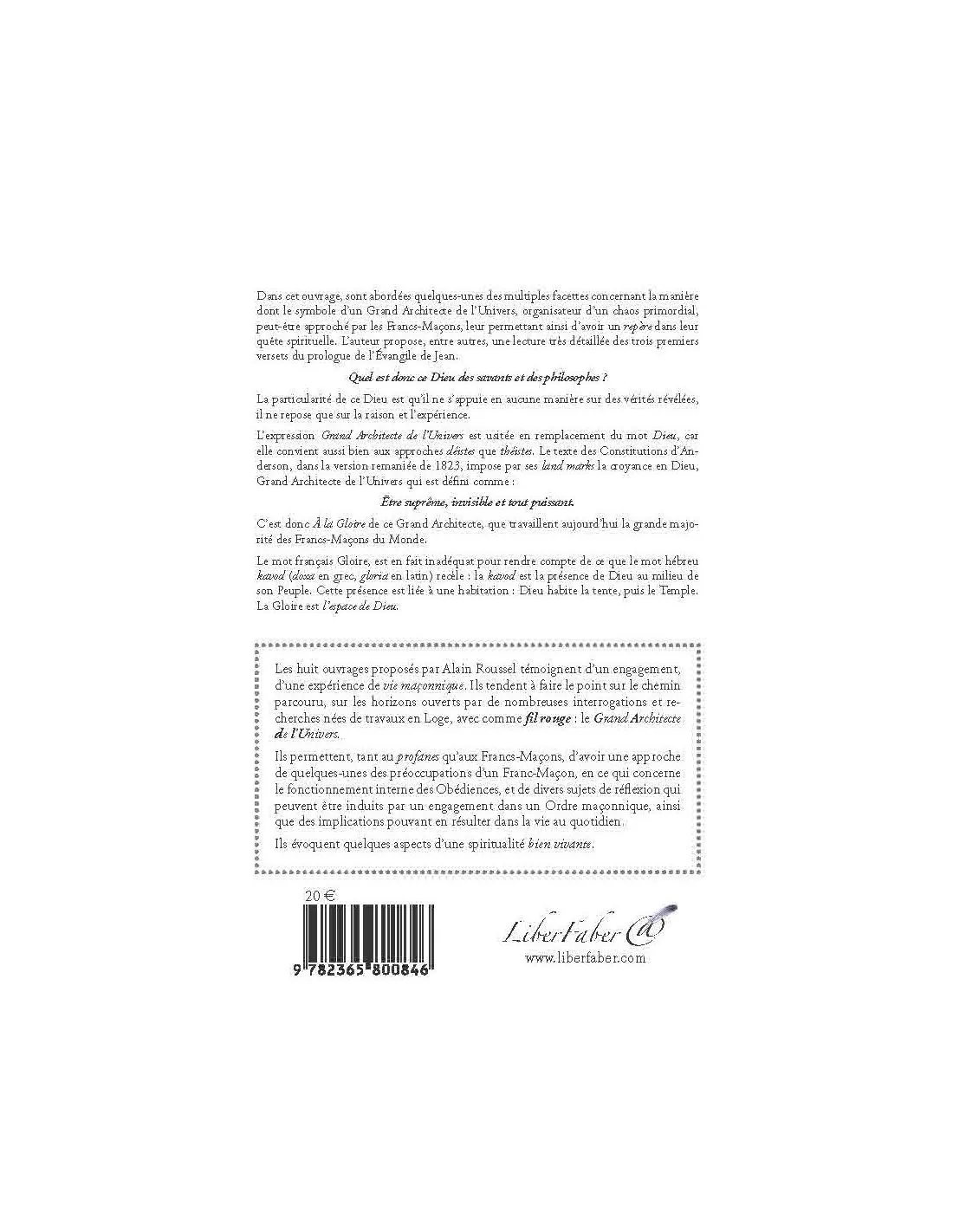 Dans cet ouvrage, sont abordées quelques-unes des multiples facettes concernant la manière dont le symbole d’un Grand Architecte de l’Univers, organisateur d’un chaos primordial, peut-être approché par les Francs-Maçons, leur permettant ainsi d’avoir un repère dans leur quête spirituelle. L’auteur propose, entre autres, une lecture très détaillée des trois premiers versets du prologue de l’Évangile de Jean.