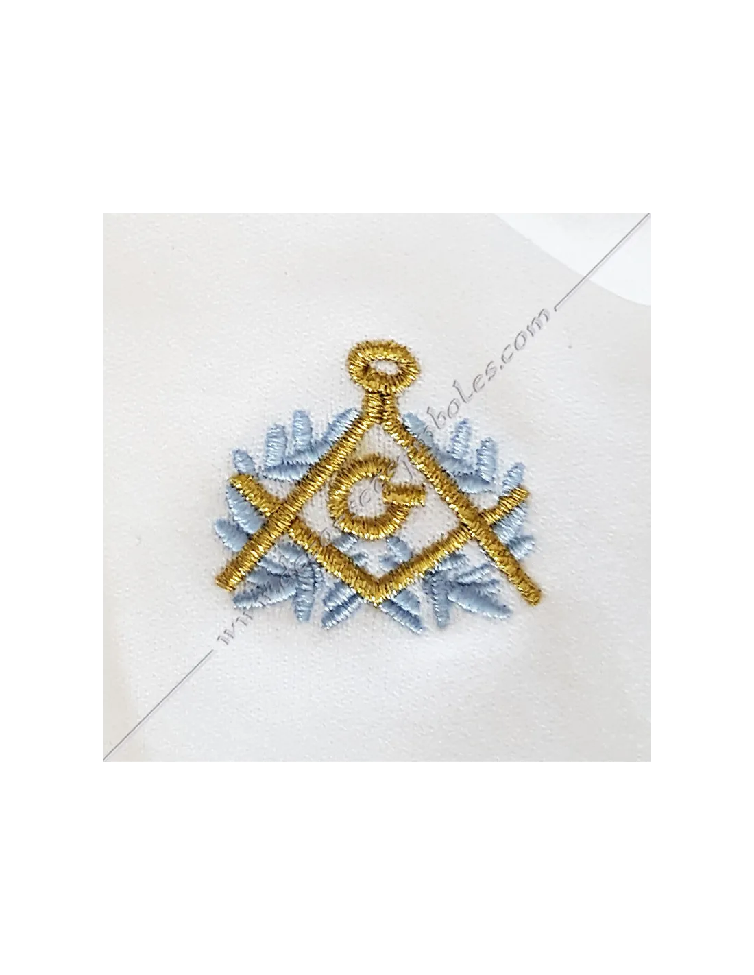 Embroidery: gold square and compass and sky blue acacia branches