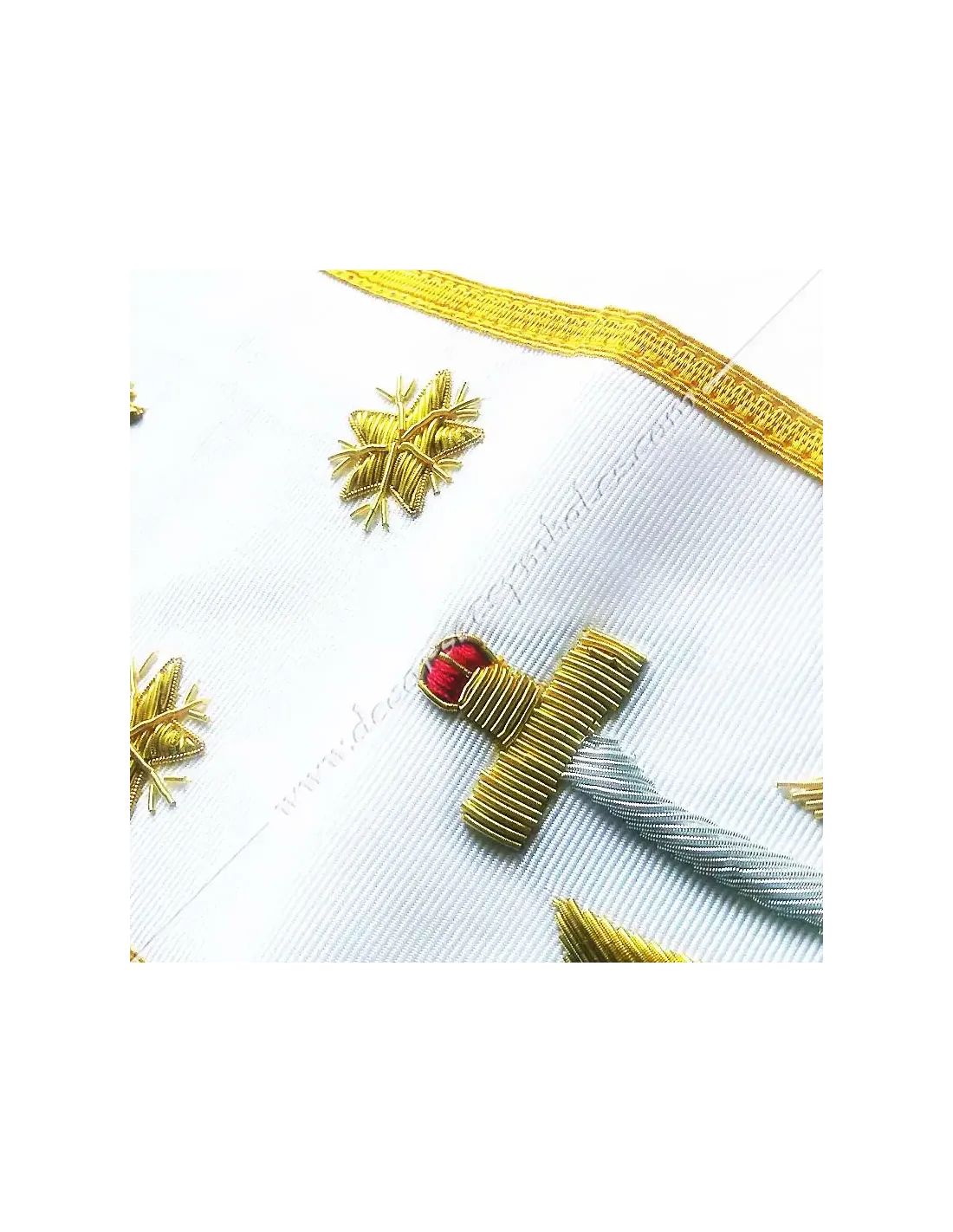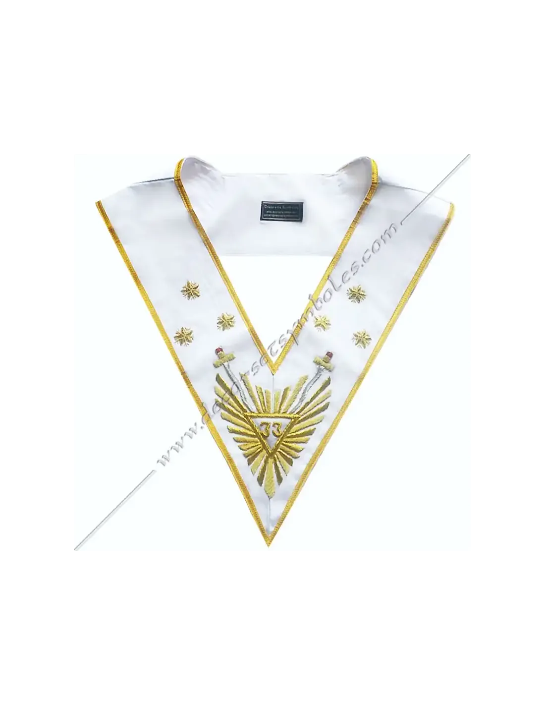Embroidery: 33 Gold in Great Glory with flaming sword and 3 Gold stars