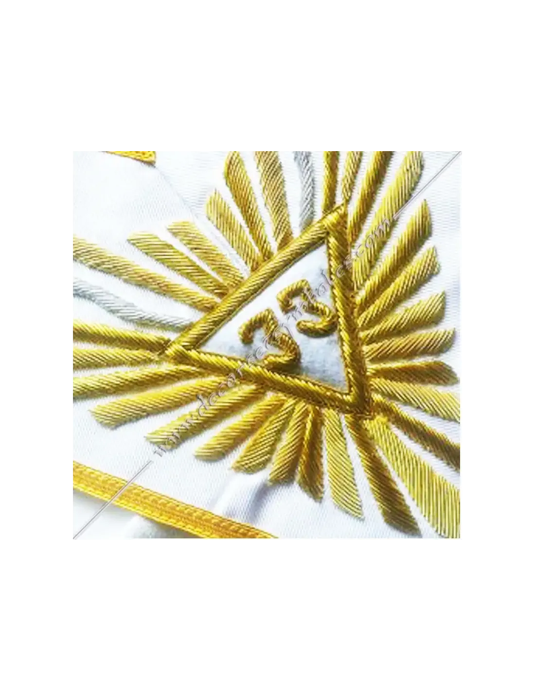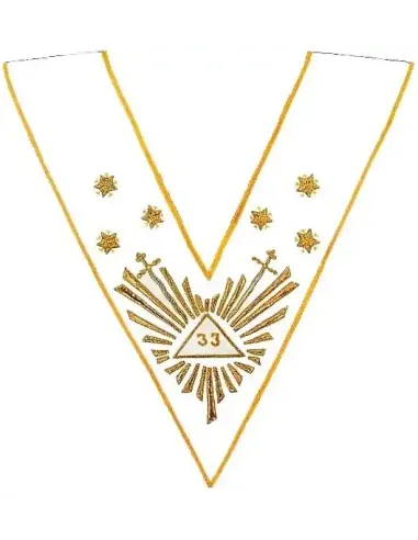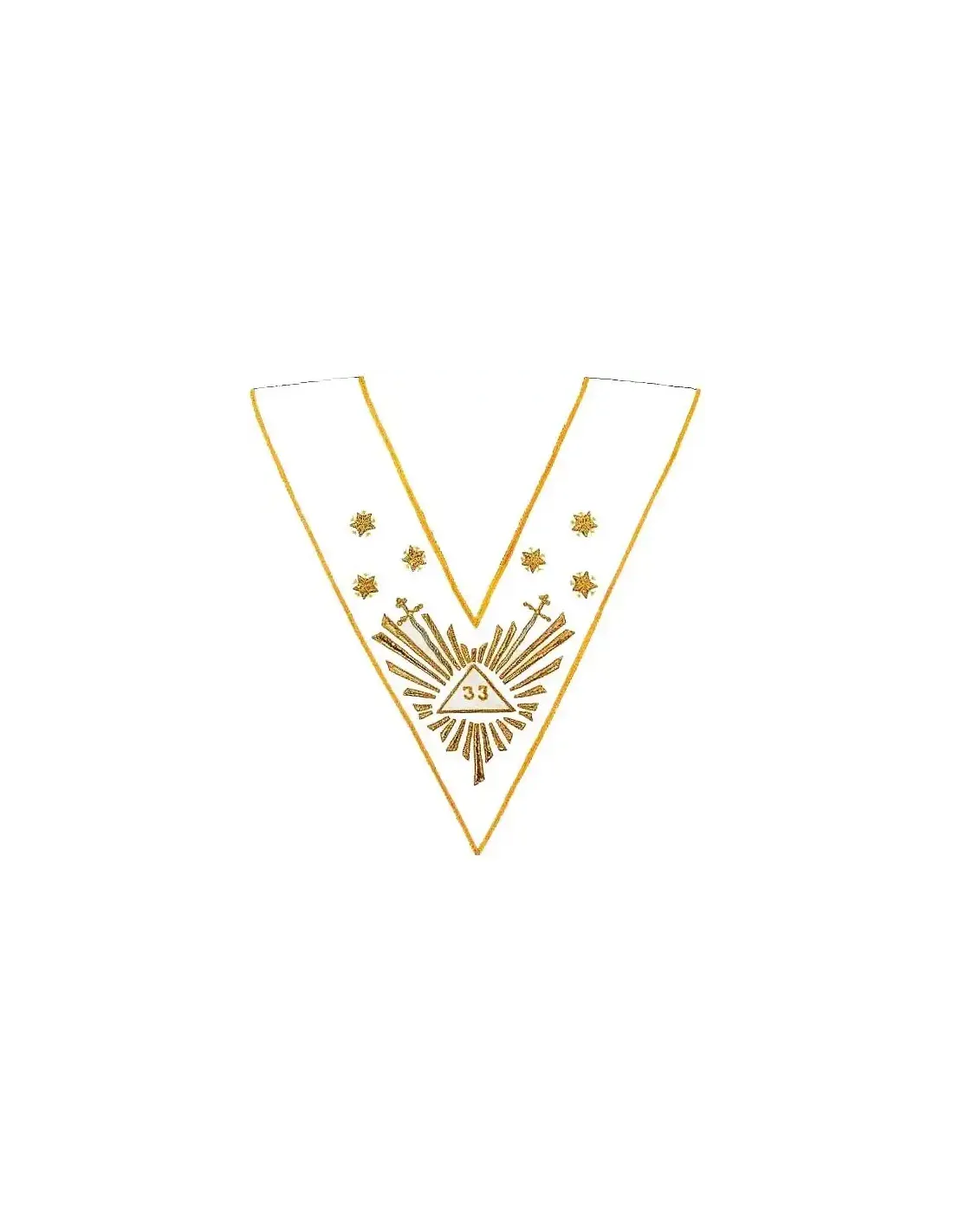 Embroidery: 33 Gold in Great Glory with flaming sword and 3 Gold stars