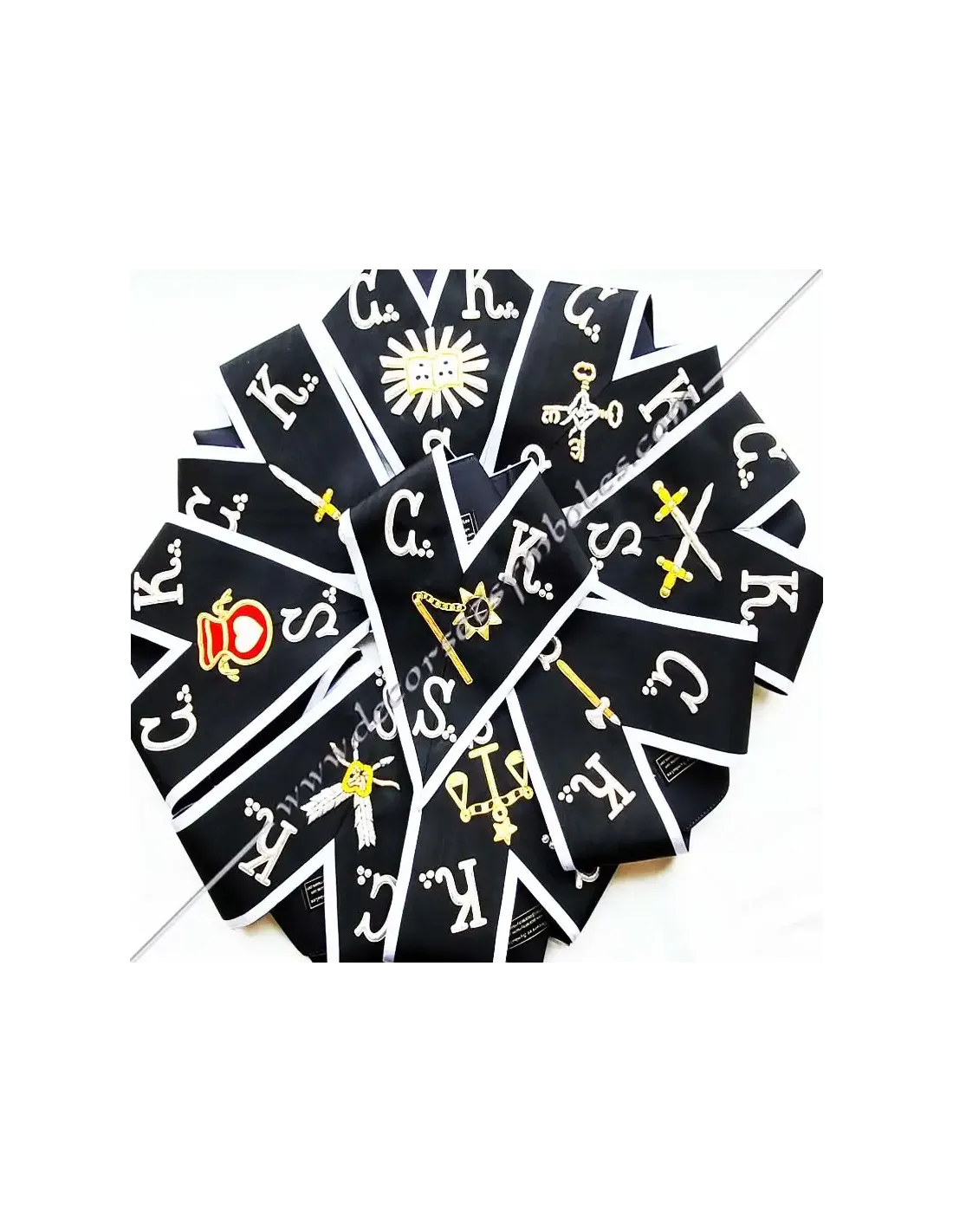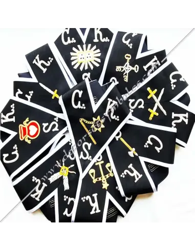 Set of 9 masonic collars or sashes for the Kadosch Knights officers of the 30th degree AASR in black moiré ribbon with white border 0.5 cm