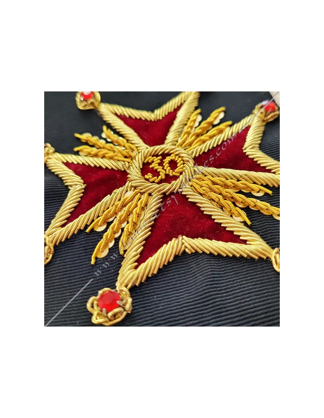 Embroidery: C.K.S. and 30 Gold within an anchored cross edged in Gold on a red background