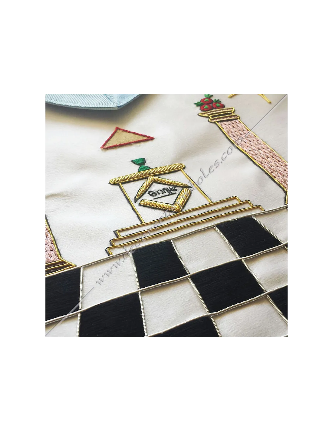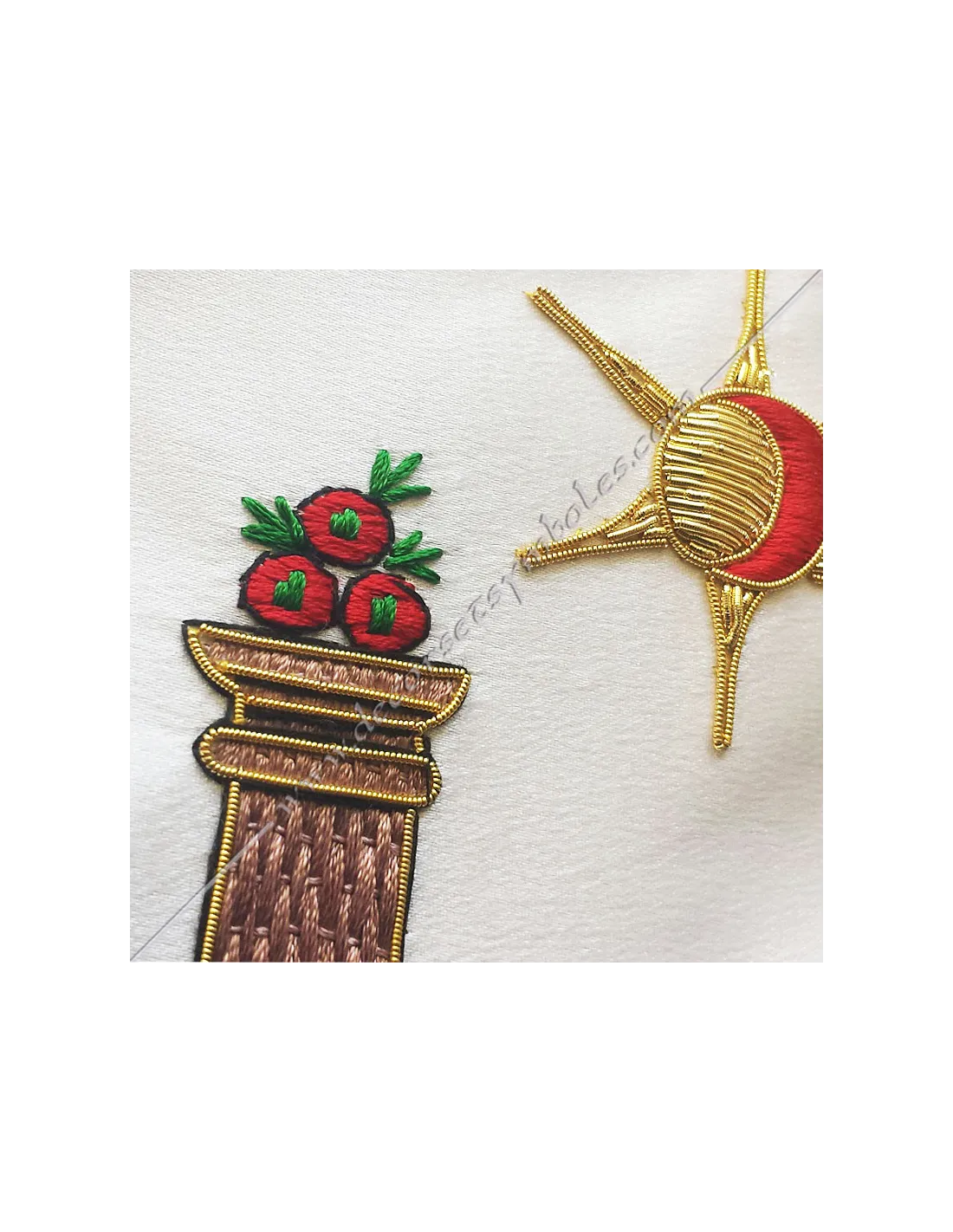 Embroidery: 2 columns, mosaic pavement, moon and sun, star with letter G on bib
