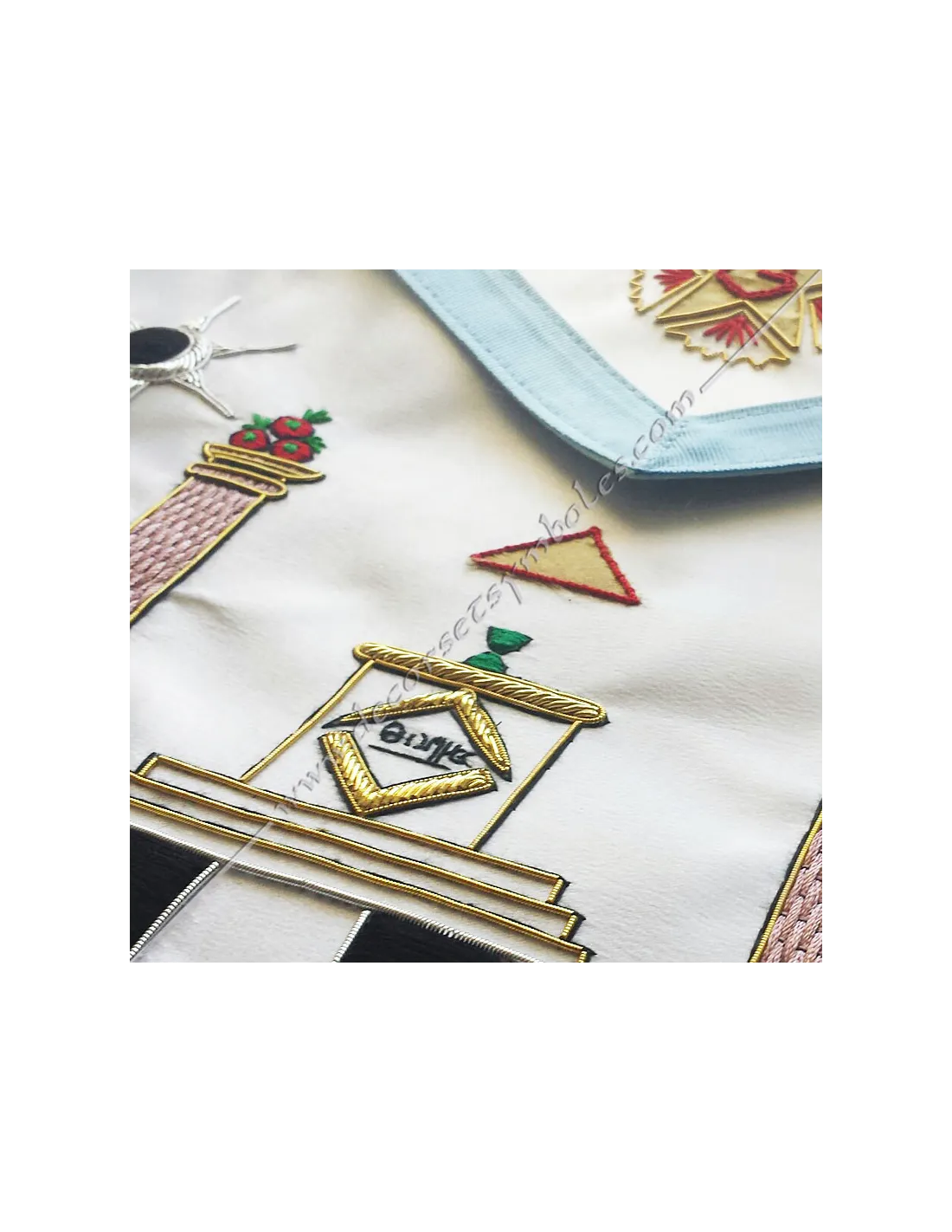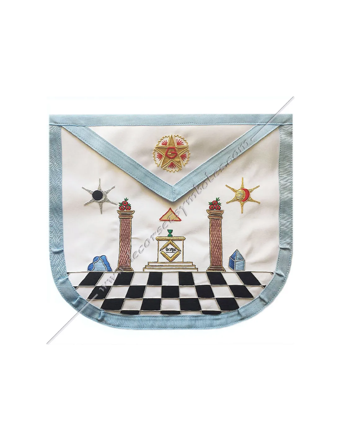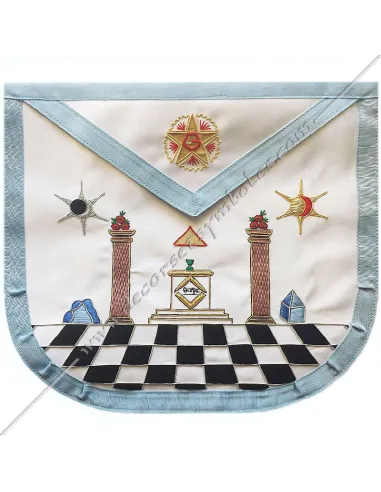 Modern French Rite Masonic master apron in white silky satin edged in sky blue