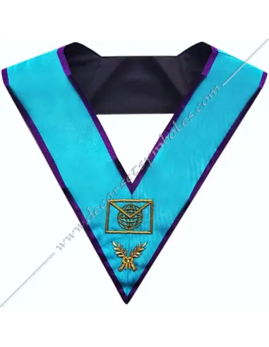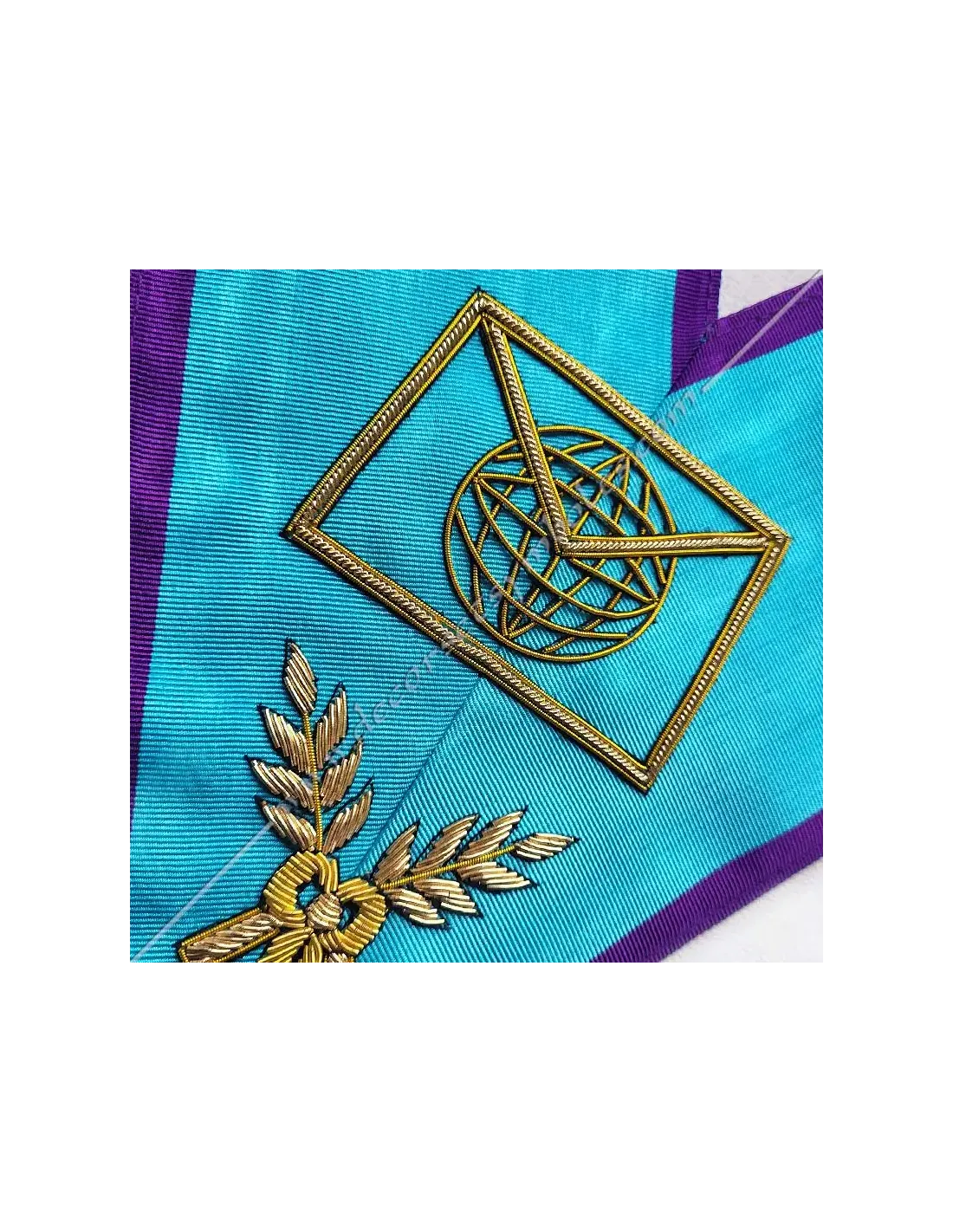 Masonic collar or sash for Officer Master of the Web or Webmaster of the Memphis Misraim Rite in turquoise moiré ribbon edged in purple with embroidered Webmaster symbol on 2 crossed acacia branches