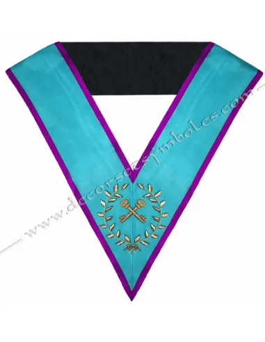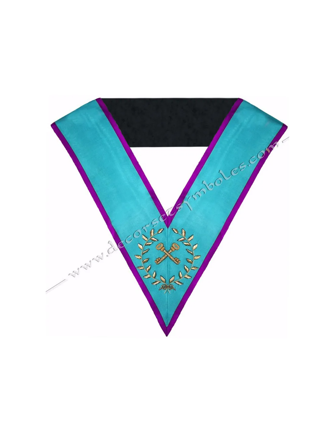 Masonic collar for the Treasurer of Memphis Misraim in turquoise moired ribbon with purple edging