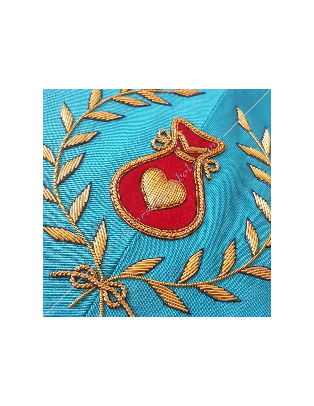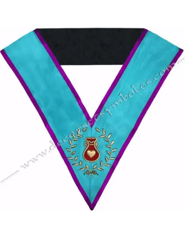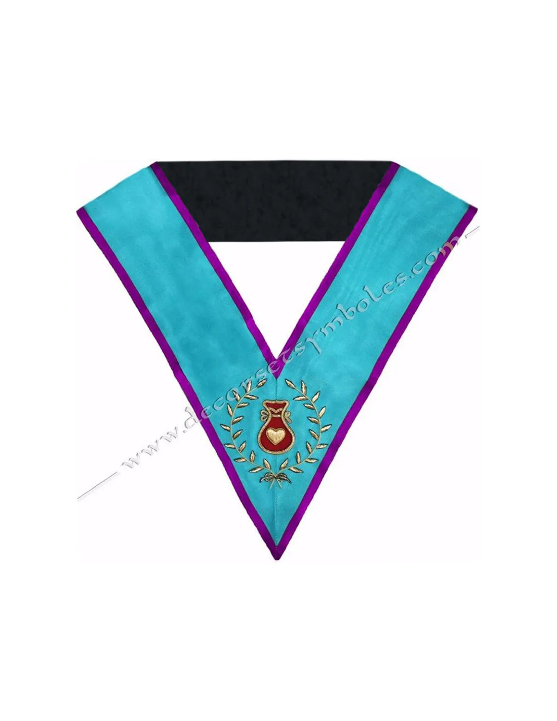 Masonic collar for the Hospitaller of Memphis Misraim in turquoise moired ribbon with purple edging