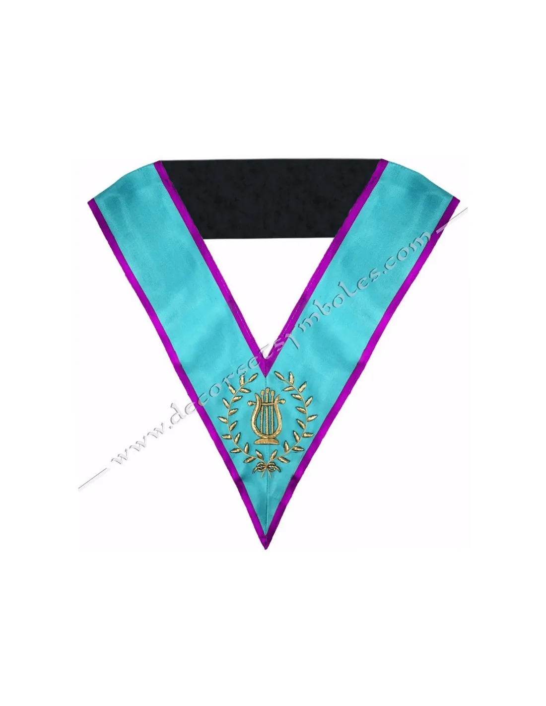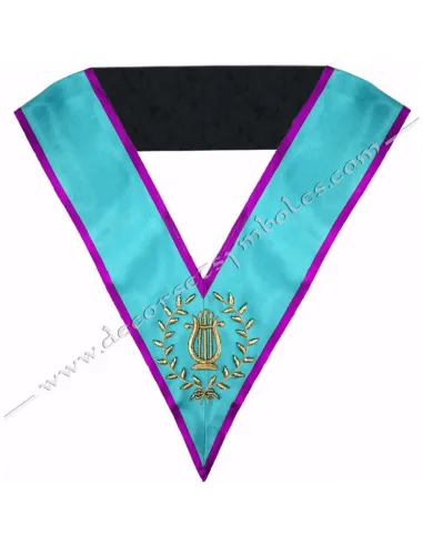 Masonic collar for the Music Master of Memphis Misraim in turquoise moired ribbon with purple edging