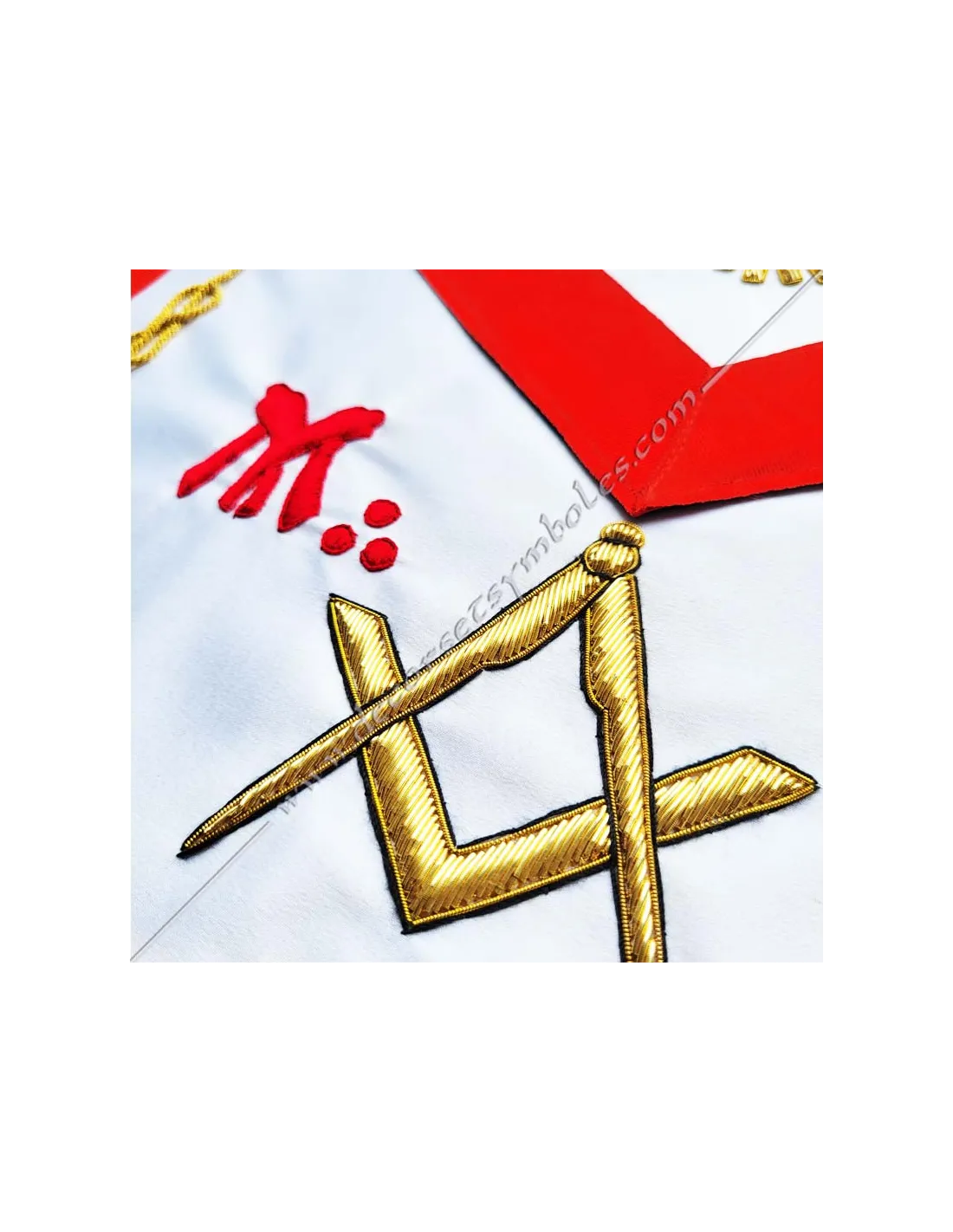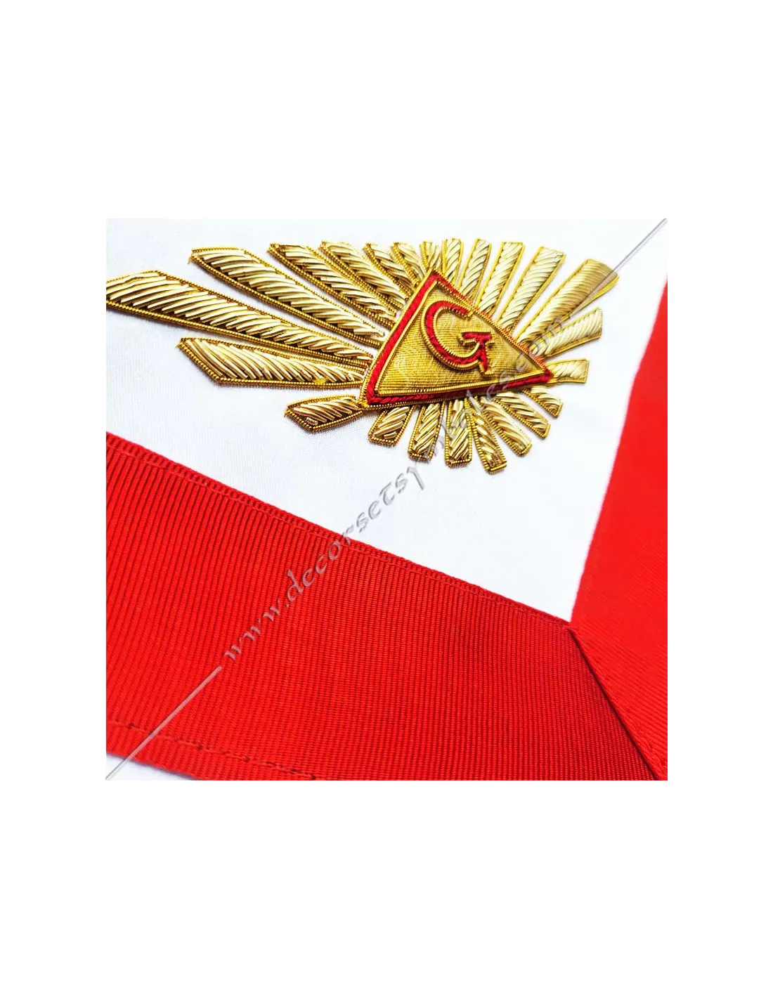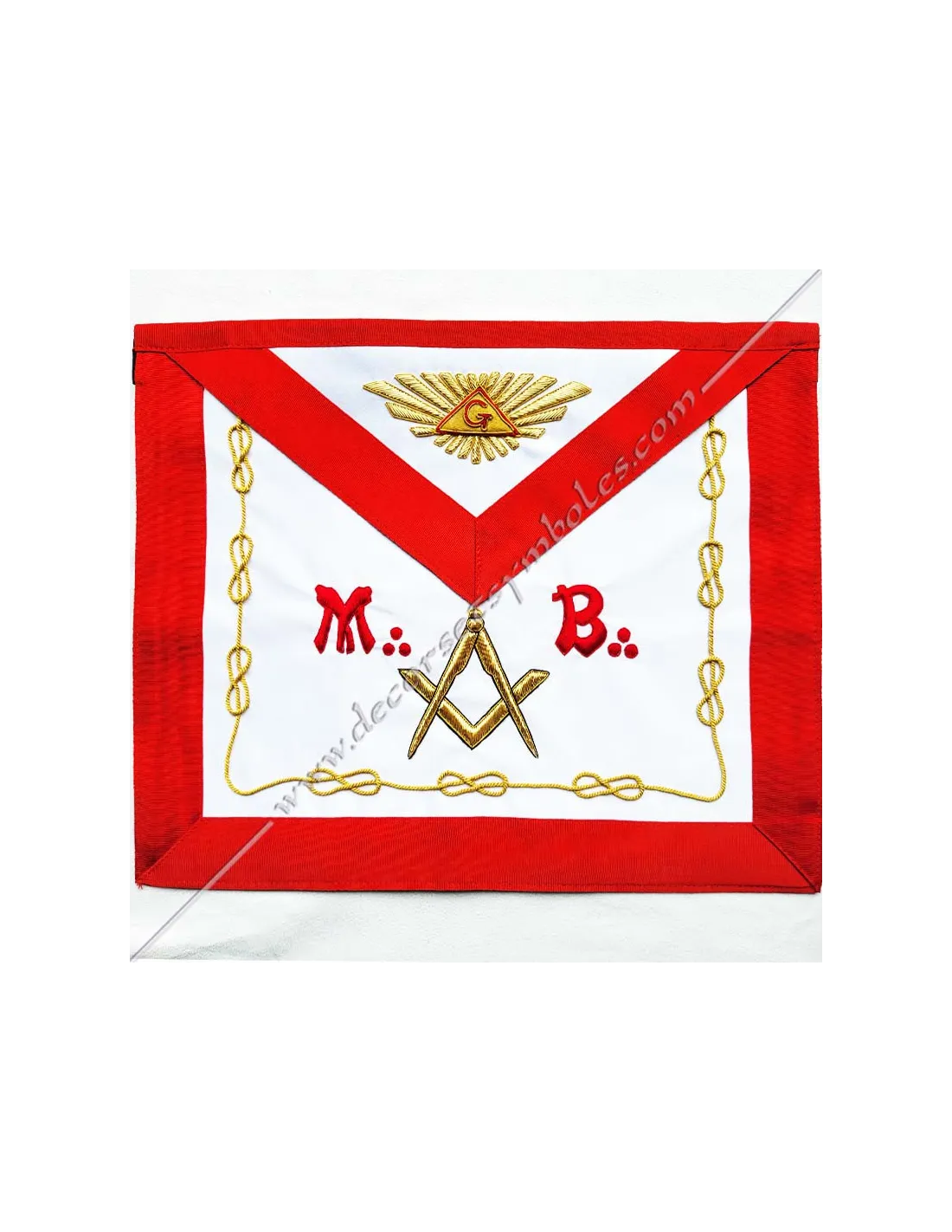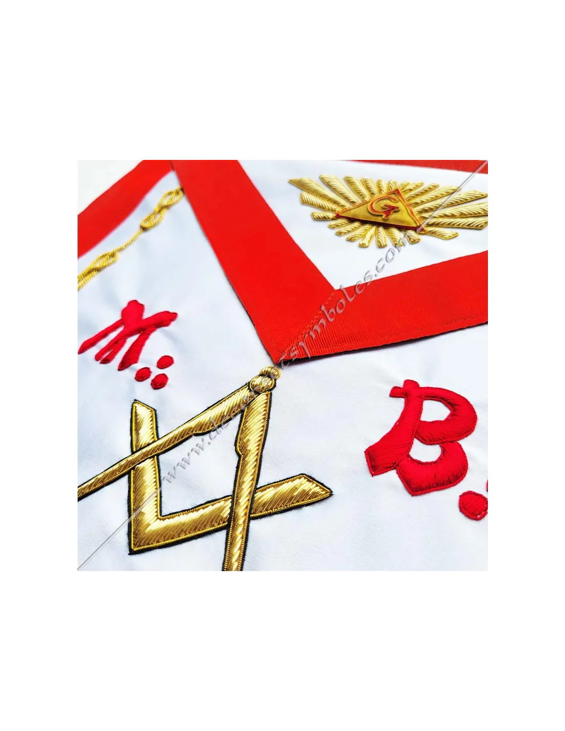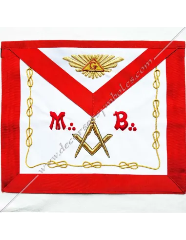 AASR Master Masonic apron in white silky satin with delta embroidery and letter G on bib, gold square and compass and letters M and B on apron