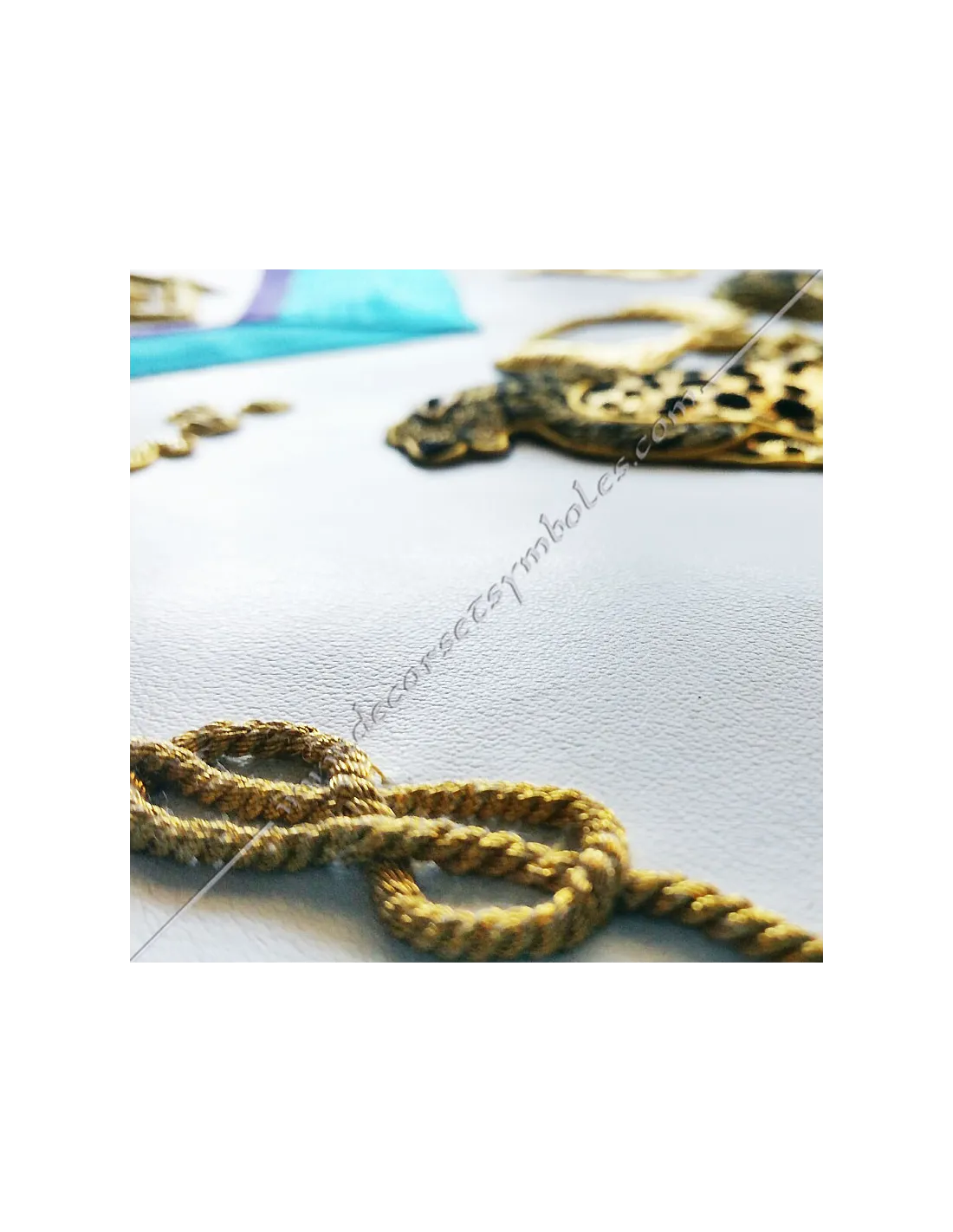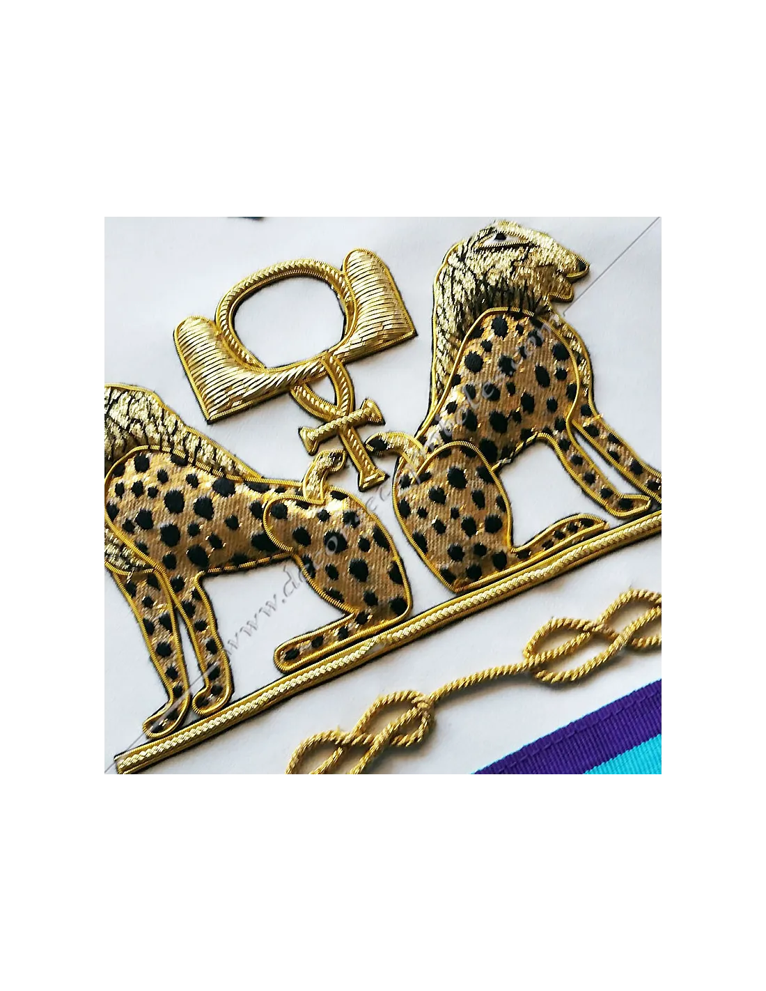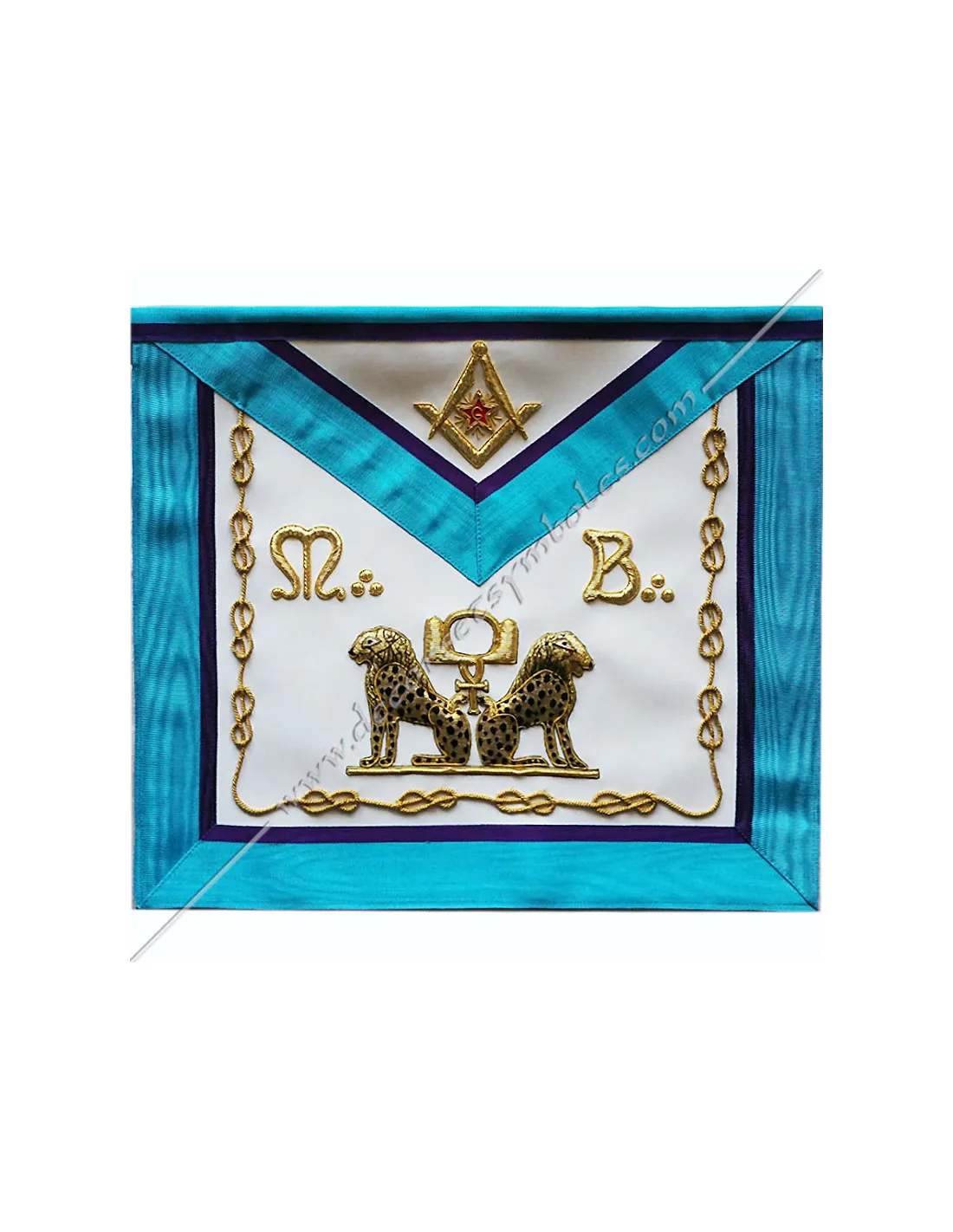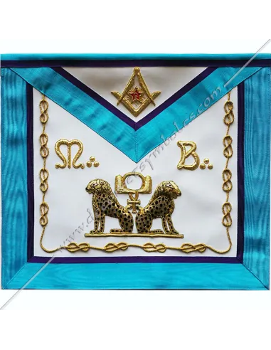 Embroidery: 2 spotted lions, gold letters M and B and gold square and compass with G on the bib
