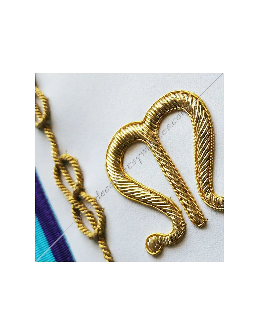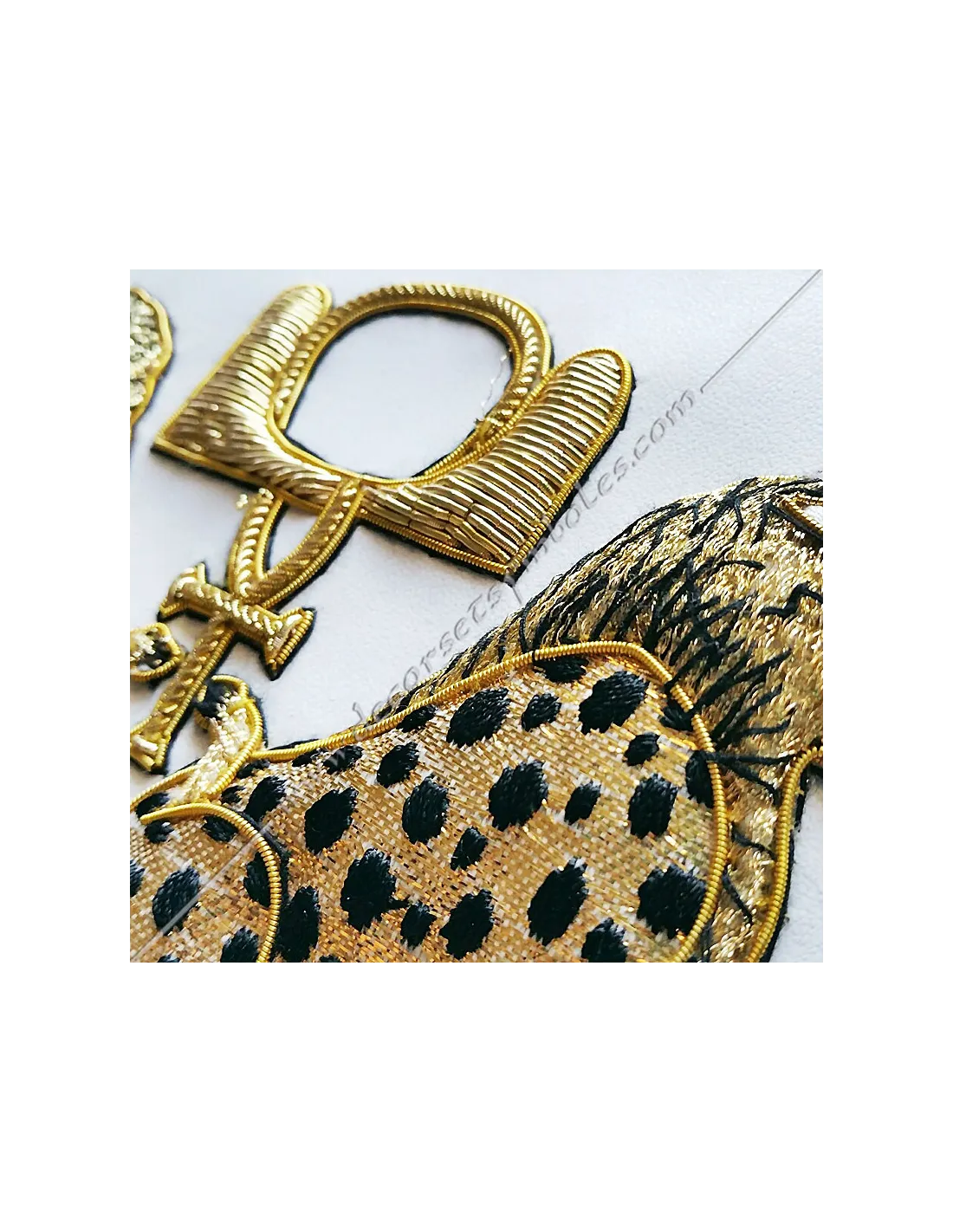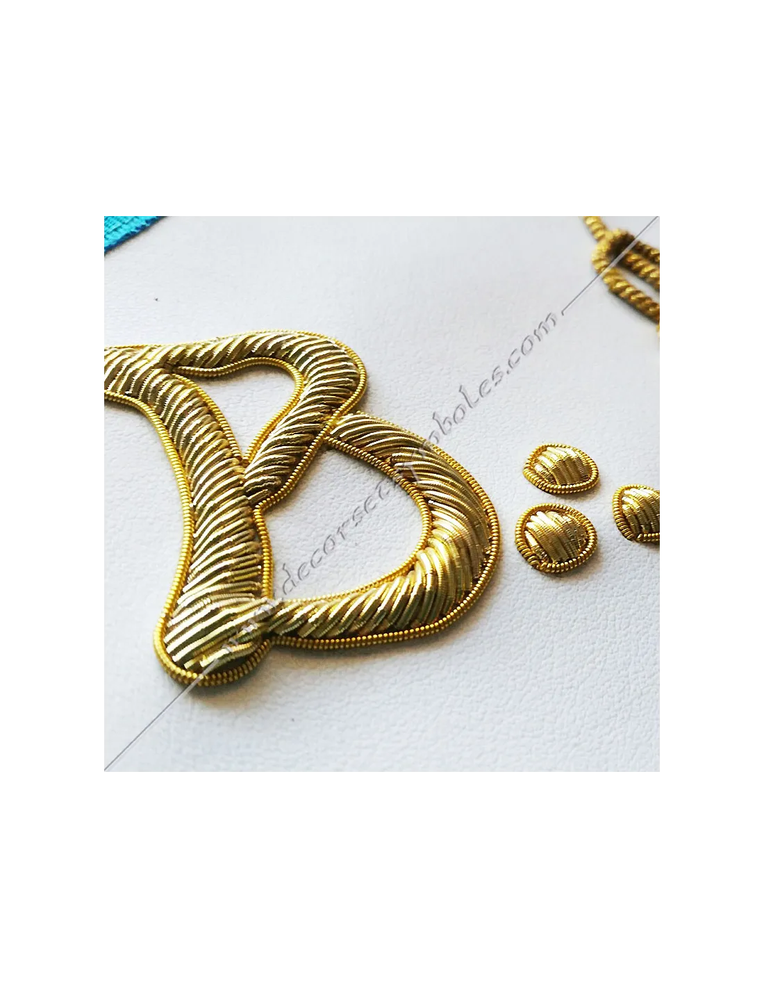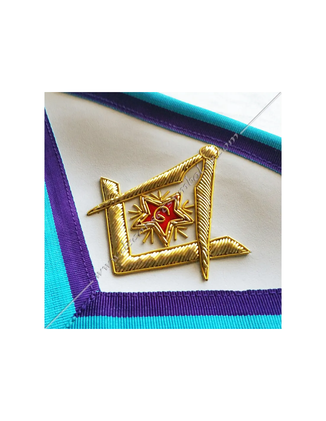 Embroidery: 2 spotted lions, gold letters M and B and gold square and compass with G on the bib
