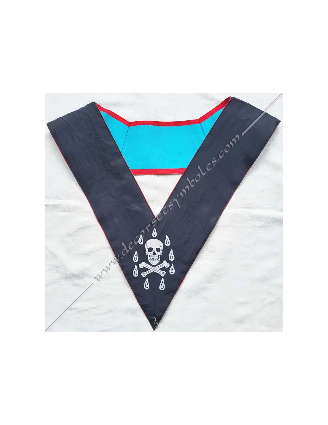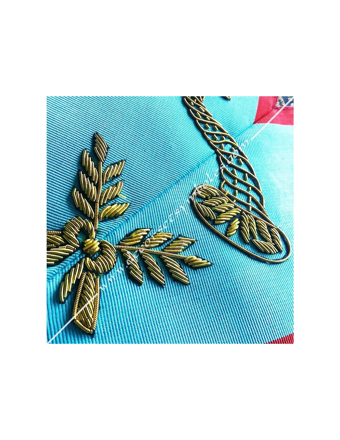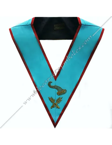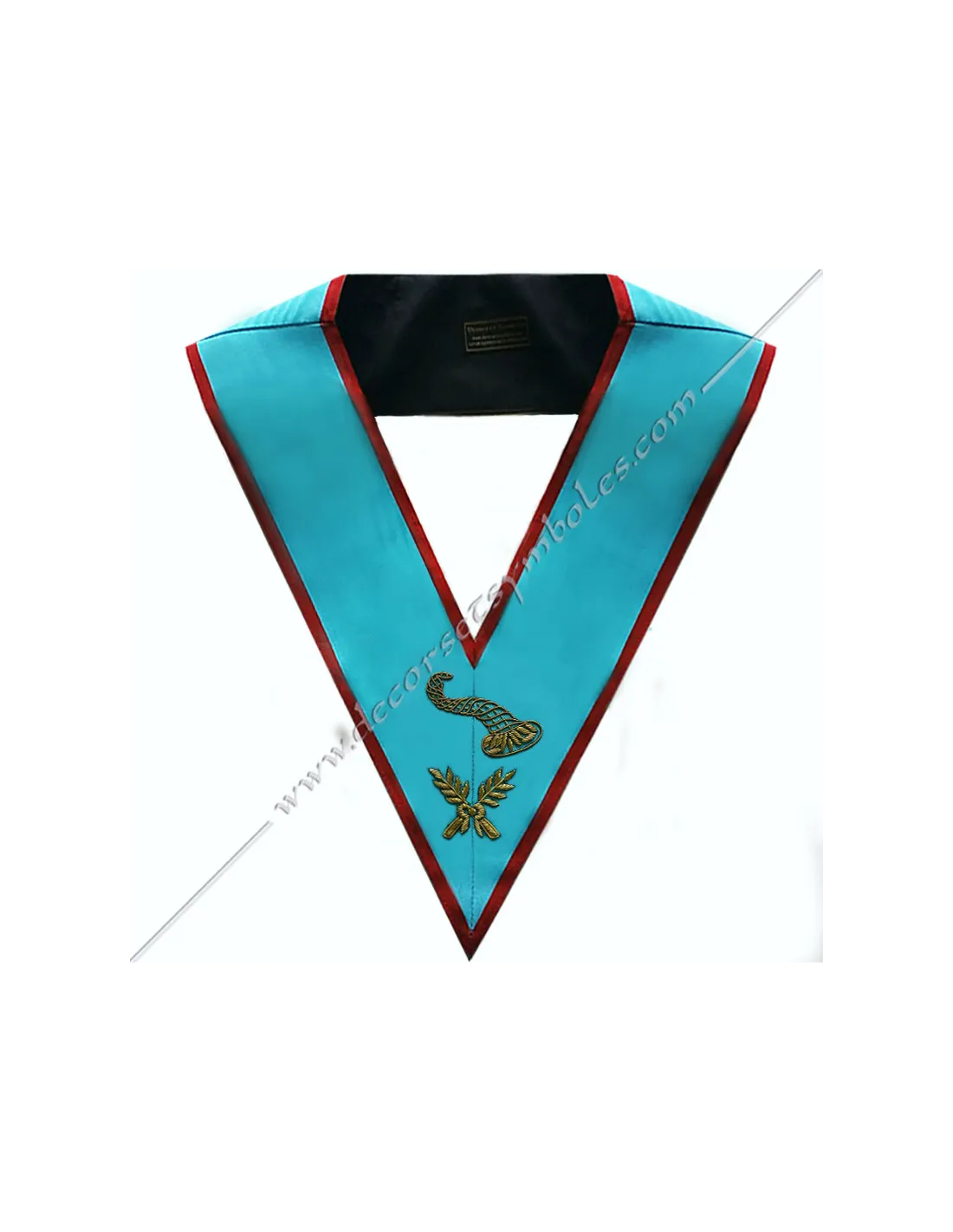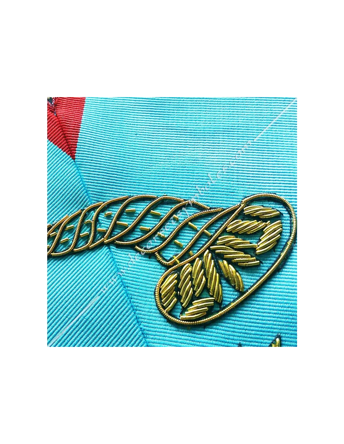 Turquoise moiré ribbon with red edging for a masonic AASR banquets master officer's collar