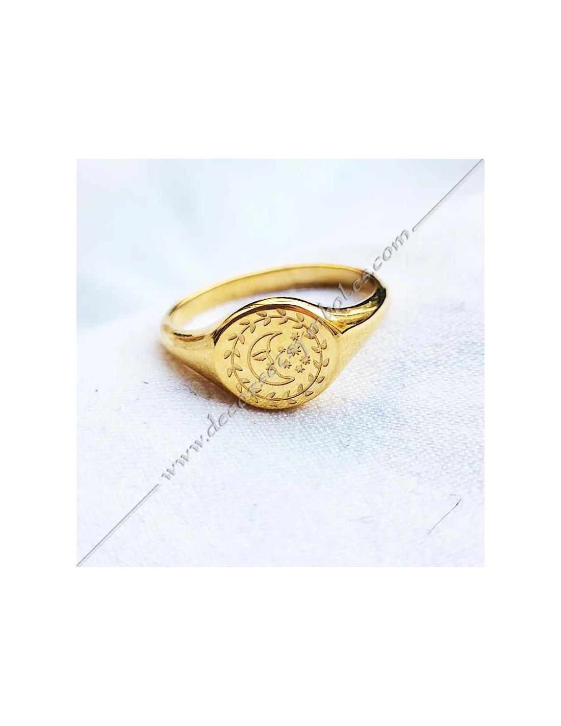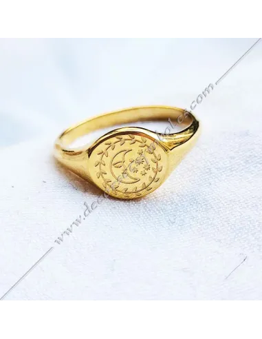 Gold-plated masonic ring with moon symbol in an acacia crown
