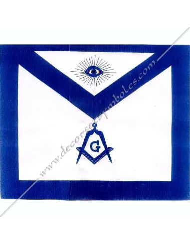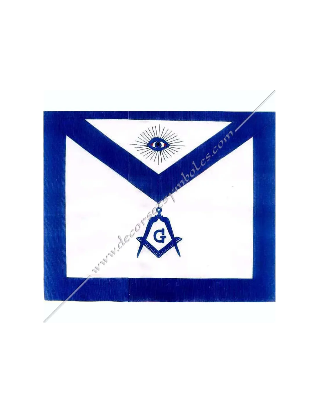 York Rite Masonic apron in imitation leather edged in blue with square and compass embroidery with letter G and eye on bib