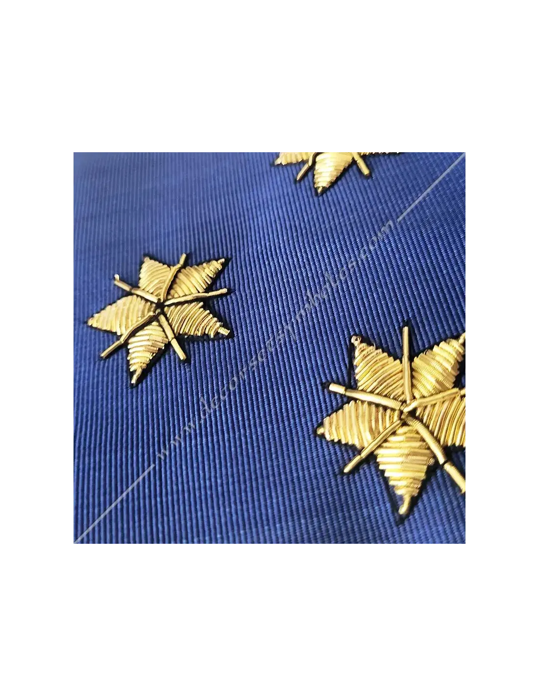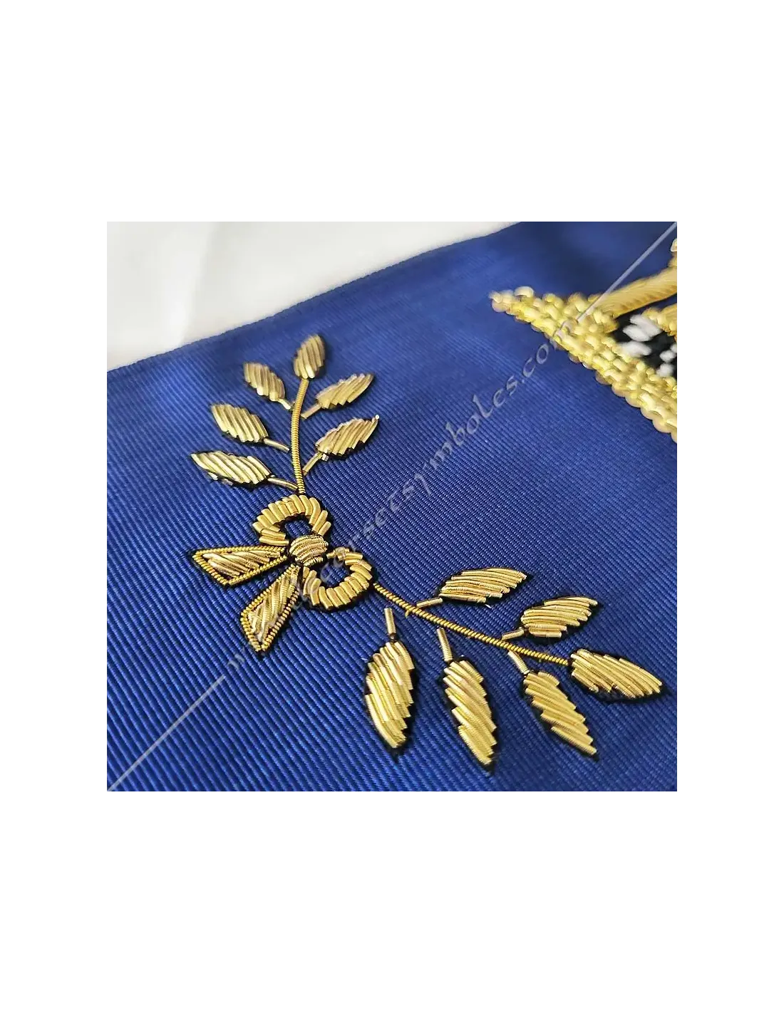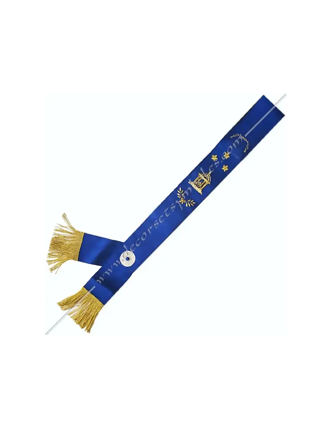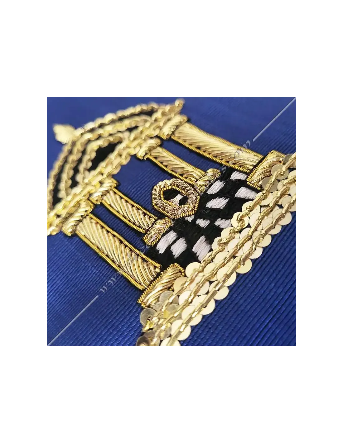 Royal blue moiré ribbon Masonic scarf or harness for the Master of the Operative Rite of Solomon or the OITAR with embroidery: temple, 3 forget-me-nots, 2 acacia branches and gold braid union chain