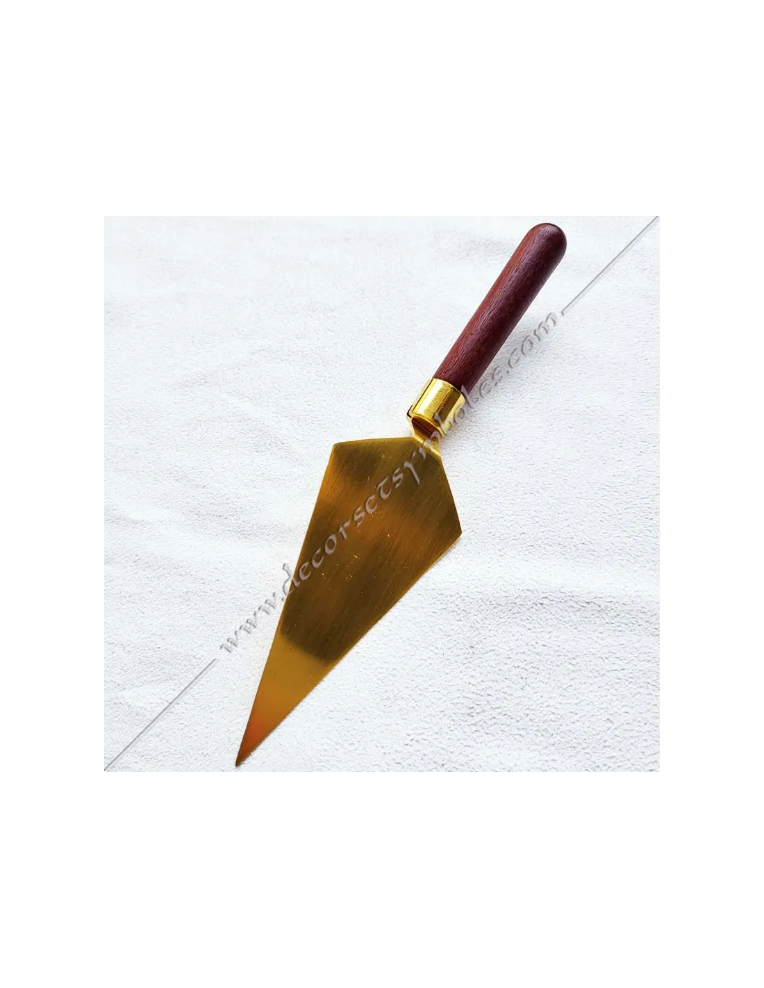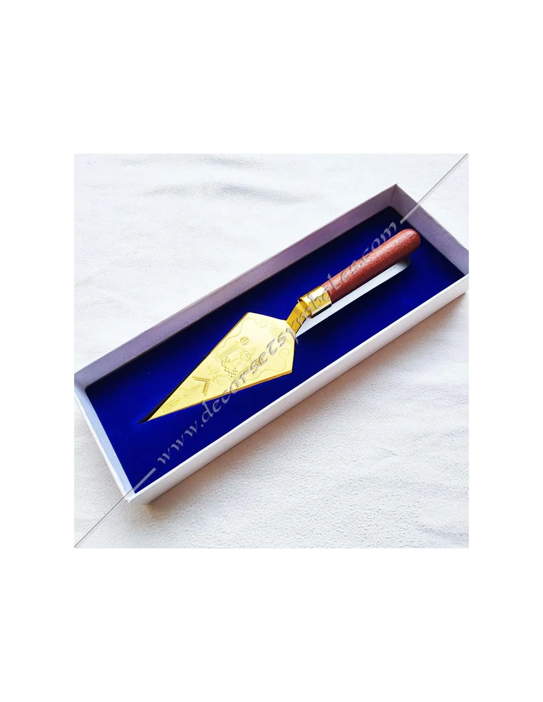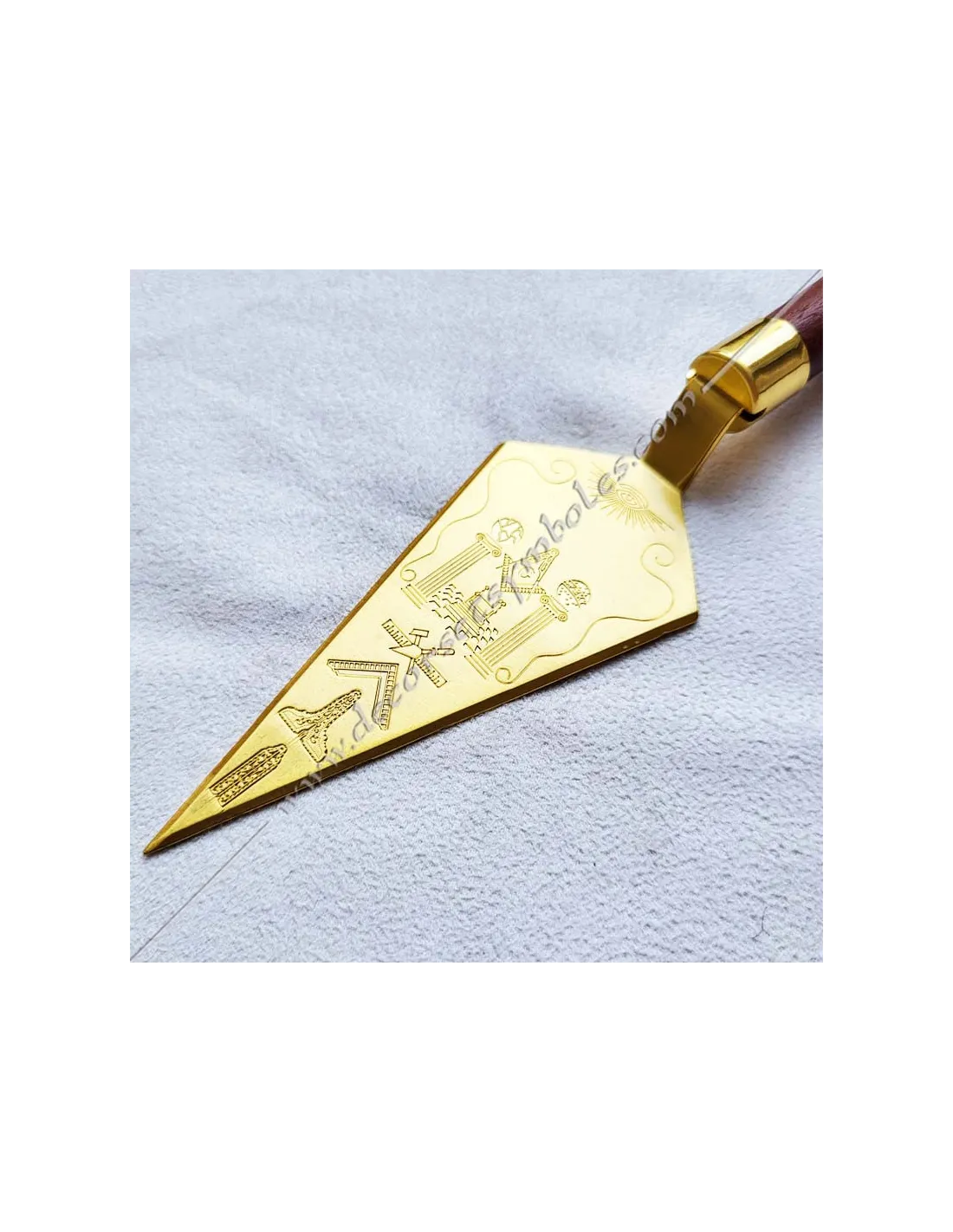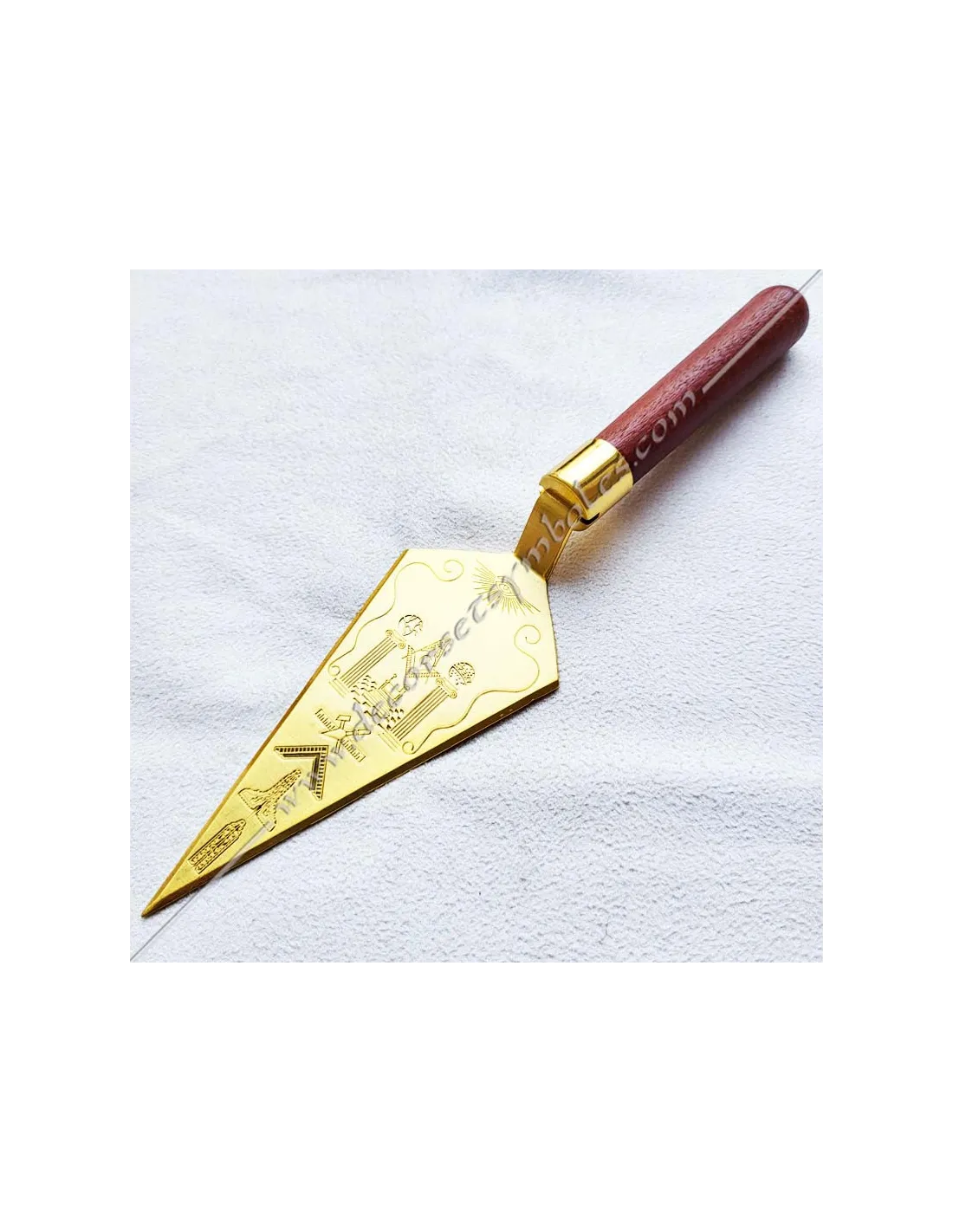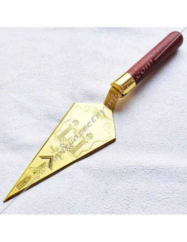 Masonic trowel in gilded and engraved metal and wooden handle
